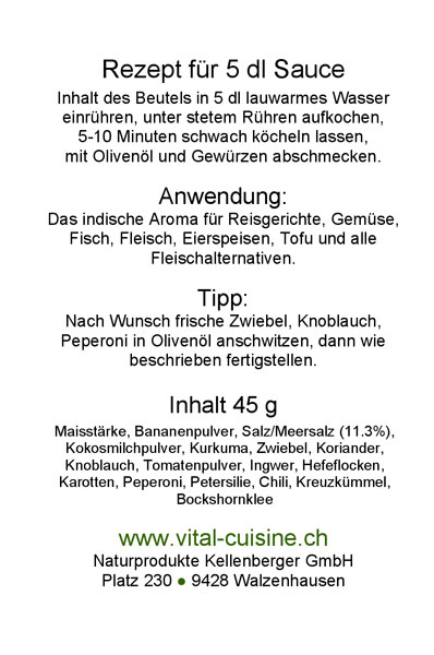 Zusamensetzung: Maisstärke, Bananenpulver, Salz/Meersalz (11,2%), Kokosmilchpulver, Kurkuma, Zwiebel, Koriander, Knoblauch, Tomatenpulver, Ingwer, Hefeflocken, Karotten, Peperoni, Petersilie, Chili, Kreuzkümmel, Bockshornklee.
