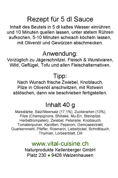 Zusamensetzung: Maisstärke, Salz/Meersalz (17.1%), Zuckerarten (13%), Pilze (Champignons, Shiitake, Mu-Err, Steinpilze, Herbsttrompeten), Zwiebel, Petersilie, Knoblauch, Tomatenpulver, Karotten, Peperoni, Gemüseextrakt, Guarkernmehl, Pfeffer, Rosmarin, Liebstöckel, Schnittlauch, Thymian, Lorbeerblatt, Dill.